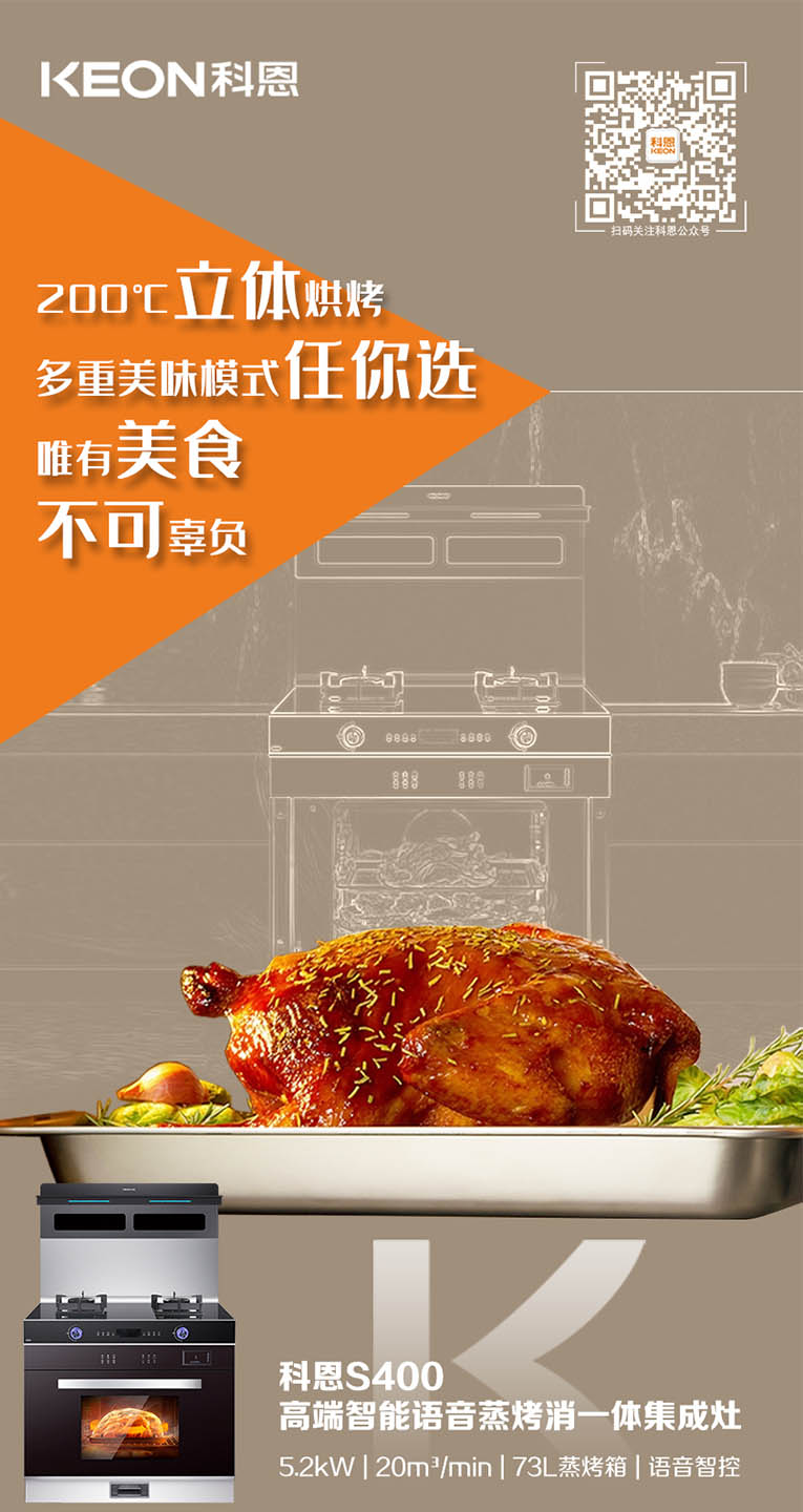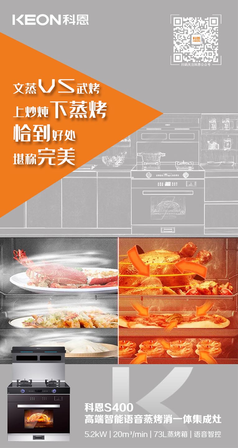 當(dāng)代年輕人的“懶”癥可謂是人盡皆知,因此烹飪美食時(shí),只求一次搞定!有效提升烹飪效率,集成灶十大品牌、廚電行業(yè)十大品牌科恩S400變頻大吸力蒸烤消一體集成灶上下平整加熱加右側(cè)雙孔蒸汽噴射,迅速升溫,美味加速,四面受熱均勻,營(yíng)養(yǎng)不流失。