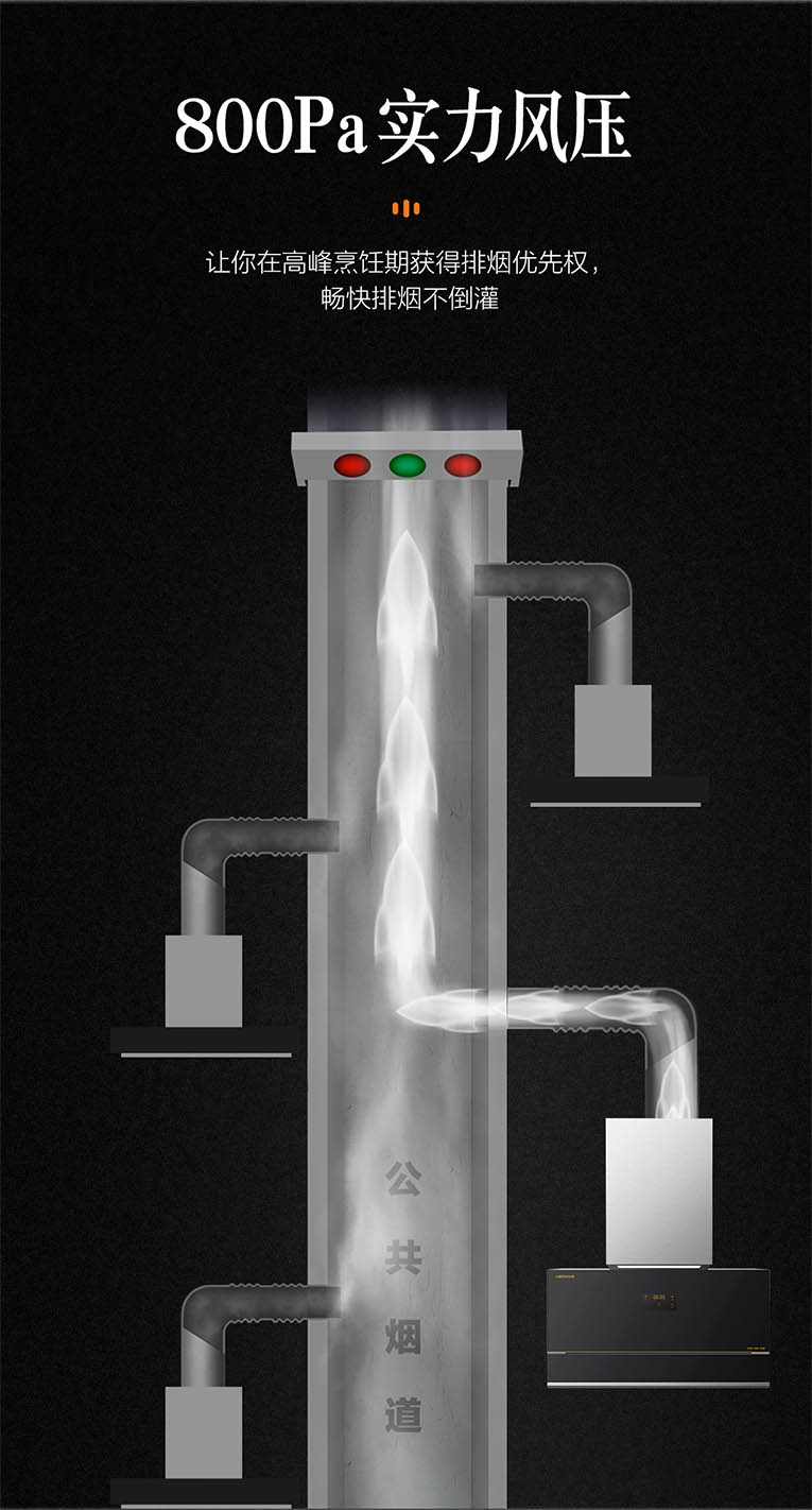集成灶十大品牌、廚電行業十大品牌科恩新一代7350變頻大吸力煙機,變頻新科技,重新定義大吸力,能針對復雜的烹飪環境、多變的公共煙道風阻,19.5±10%大風量,800Pa大風壓,能夠快速突破風壓極限,遇強則強,八檔風速迅速調節,達到最佳抽油煙機效果,而當煙道內壓力較小時,煙機則自動調節轉速風壓,保持恒定大吸力,確保油煙不逃逸、不倒灌,能有效解決油煙跑煙問題。