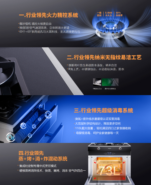 C系列集成灶配備的四項(xiàng)行業(yè)領(lǐng)先創(chuàng)新技術(shù):火力精控系統(tǒng)、納米無指紋易潔工藝、超級消毒系統(tǒng)、蒸烤消炸混動系統(tǒng)——直擊當(dāng)下消費(fèi)痛點(diǎn),徹底解決用戶使用需求,從大火力大吸力、易清潔易打理、廣收納懂消殺、多功能全集成四個維度力破當(dāng)下行業(yè)四大頑固堵點(diǎn)。