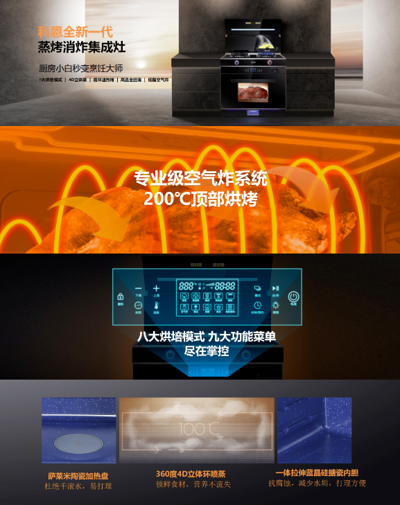 除了在外形上的顛覆常規(guī)、以型造境之外,C系列集成灶在功能實(shí)用上的優(yōu)勢也可圈可點(diǎn),以C260蒸烤消炸集成灶為例,集鮮蒸、嫩烤、消殺、空氣炸于一體,美味健康四合一。八大烘焙模式、九大功能菜單、4D立體蒸、循環(huán)速熱烤、高溫全腔消、低脂空氣炸,自動烹飪,輕松上手,一臺科恩C260集成灶頂?shù)昧艘粋€專業(yè)級烹飪大師,實(shí)在令人心動!