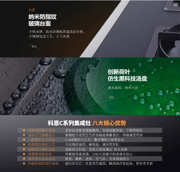 值得一提的是科恩C系列集成灶在用戶最為犯難的清潔打理方面也頗為用心,全系采用納米防指紋玻璃臺面,不沾油漬,防水防滑耐高溫,清潔尤為便捷,臺面四周為不銹鋼包邊工藝,不僅外觀美觀大氣,而且可以有效防止湯汁滲漏滴落至地面,從而杜絕滑倒等意外情況的發(fā)生。另外,湯盤采用的是創(chuàng)新荷葉仿生黑科技湯盤,納米自潔,滴油不沾,遇水成珠!不難想象,在擁有如此黑科技的集成灶上烹制美食,該是一種多么難以言喻的放松和愜意!