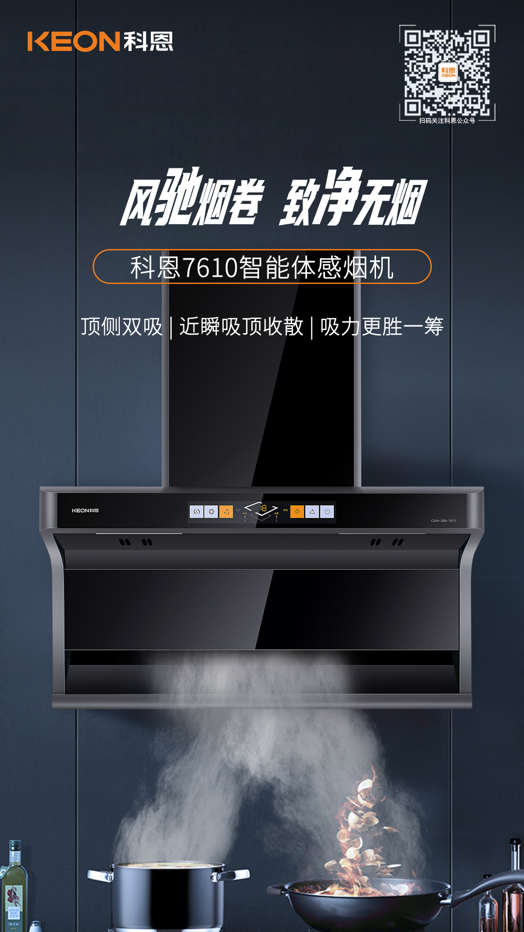 萬家燈火不及小家煙火,一家三口,一日三餐,可別讓油煙壞了好心情!科恩新款頂側雙吸平板煙機7610想你所想,讓人間煙火變得清爽溫暖!