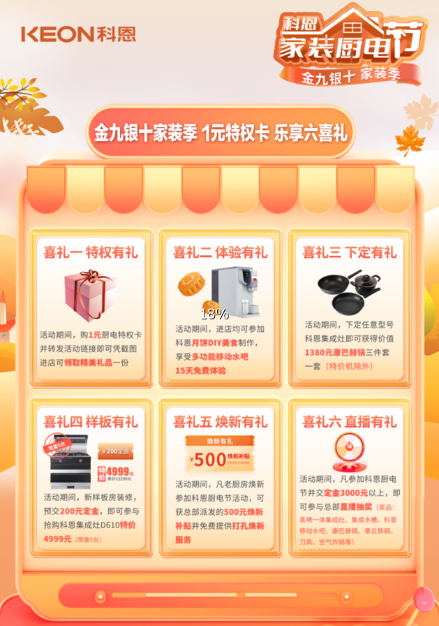 金九銀十科恩家裝廚電節,1元特權卡,樂享六喜禮,還有超多精彩福利安排,這個假期等你來嗨!