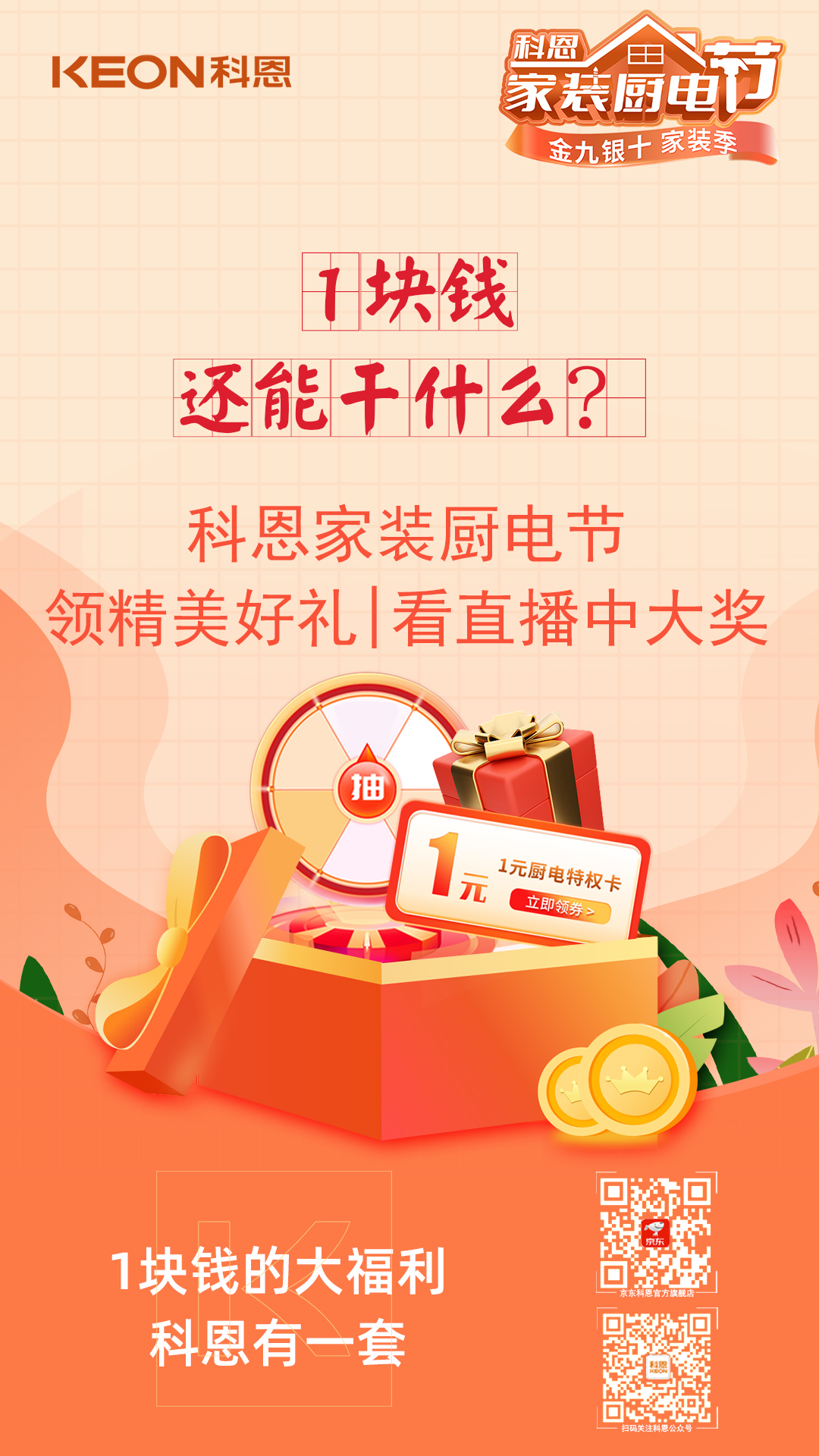 金九銀十家裝季,科恩家裝廚電節(jié),1元特權(quán)卡,樂享六喜禮,福利連連,驚喜不斷,趁此機(jī)會(huì),用更優(yōu)惠的價(jià)格購得稱心如意的廚電好物,年前入住美滋滋!