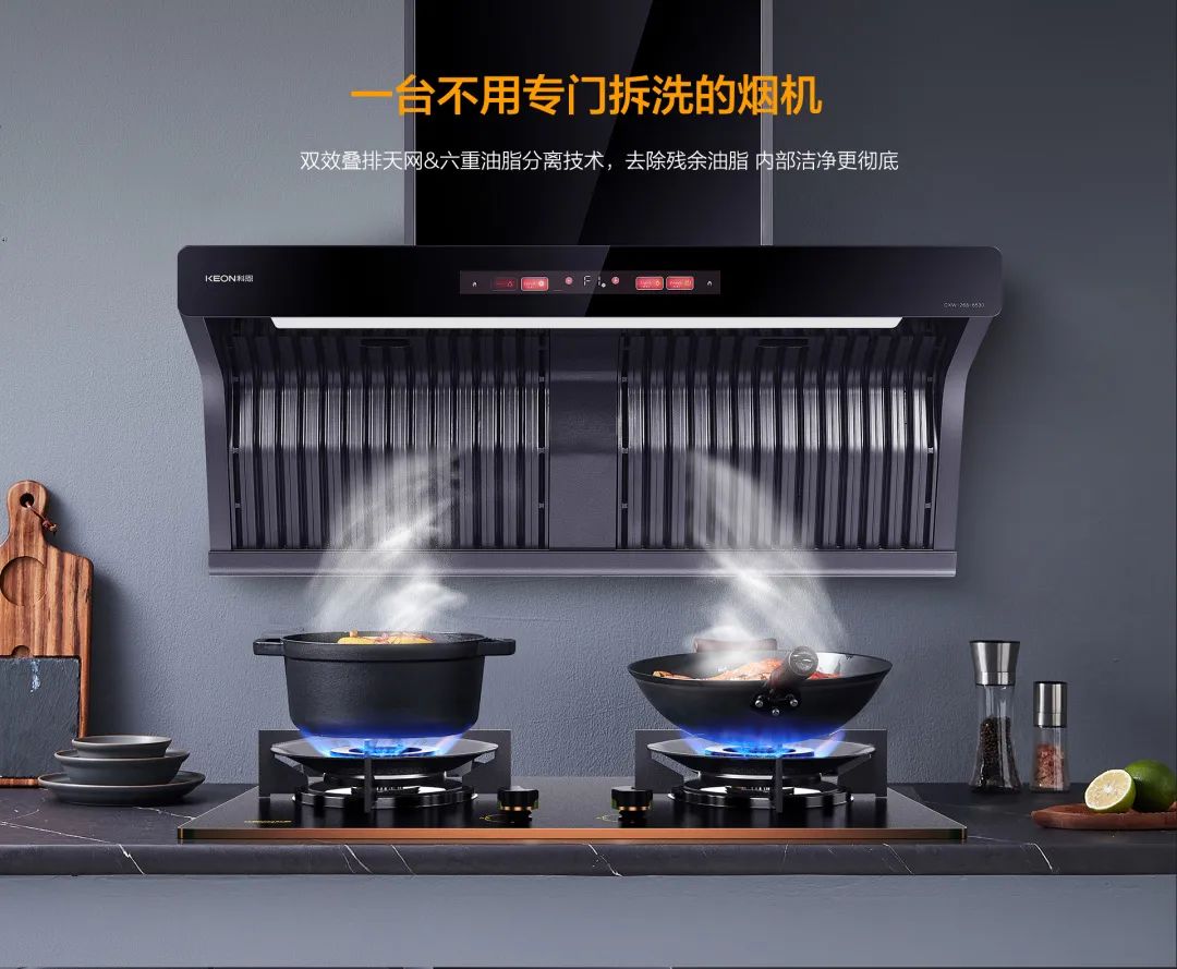 現(xiàn)代人廚房生活討厭TOP榜單第一名:煙機(jī)清洗!為解決這個(gè)難題,科恩研發(fā)了免清洗煙機(jī),雙效疊排天網(wǎng),將油煙層層阻攔,油脂分離高達(dá)96%!煙機(jī)免清洗,廚房更省心!