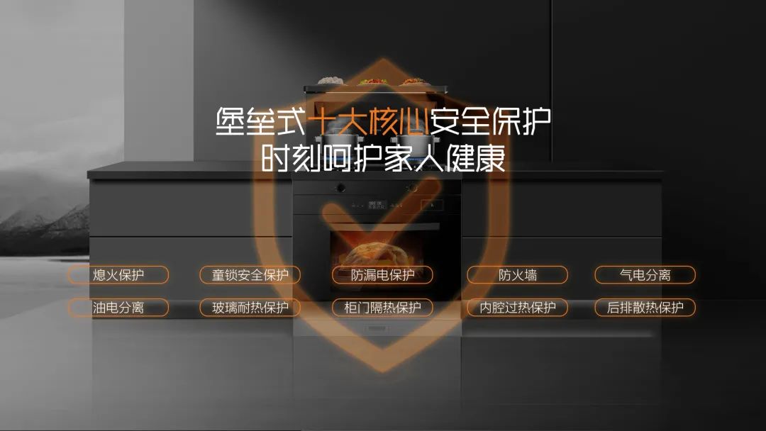 熄火保護(hù)、童鎖安全保護(hù)、防漏電保護(hù)、防火墻、氣電分離、油電分離、玻璃耐熱保護(hù)、柜門隔熱保護(hù)、內(nèi)腔過熱保護(hù) 、后排散熱保護(hù)。十大安全防護(hù),保障烹飪安全!