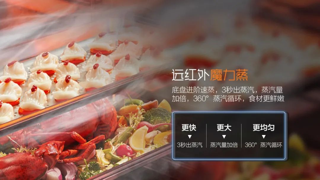 燒烤油炸固然美味,偶爾也需要來點養生蒸菜!A3系列采用底盤進階速蒸,3秒出蒸汽,蒸汽量加倍,360°蒸汽循環,蒸的更美味!
