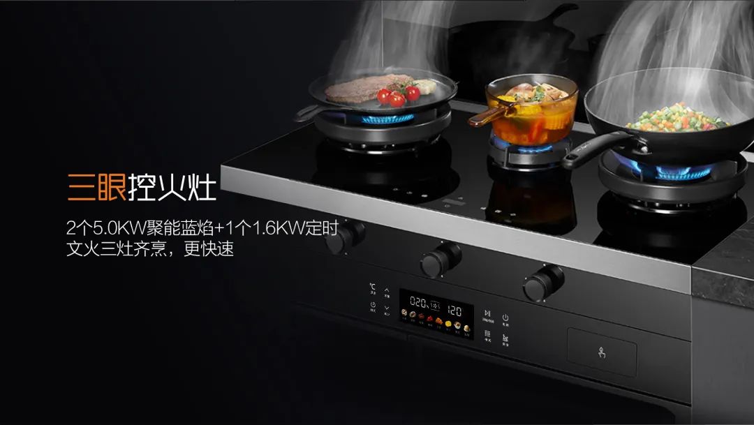 科恩A3系列獨特的三眼控火灶設置,2個5.0KW聚能藍焰+1個1.6KW定時文火,開一次火就可搞定兩菜一湯!