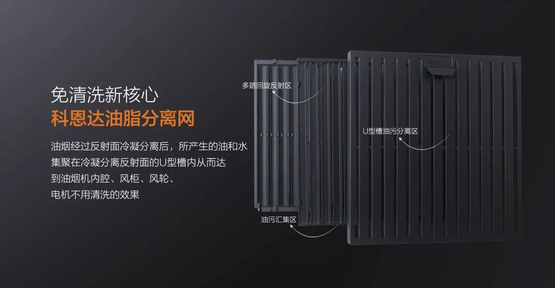 科恩免清洗煙機獨創科恩達油脂分離網,采用易潔太空壓鑄鋁材,搭配酸洗-噴砂工藝加之特氟龍噴涂最后高溫燒結,不僅不沾油、易清潔更好打理。在分離油煙的同時,還能阻燃阻熱!