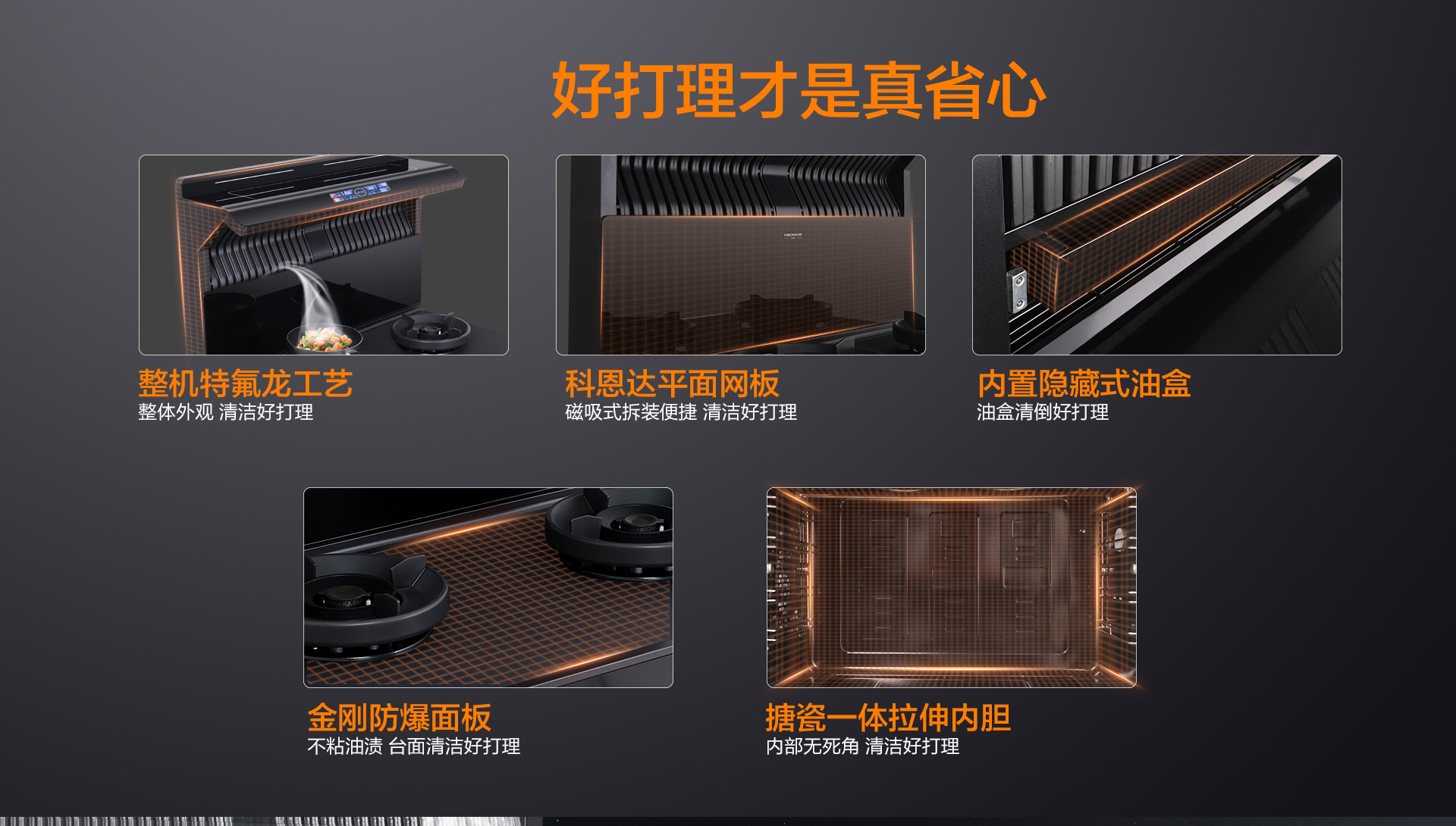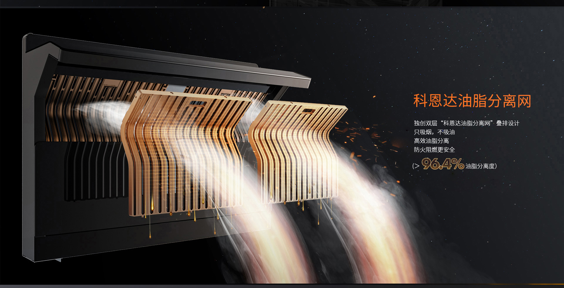 在工藝上經(jīng)過酸洗-噴砂工藝加之特氟龍噴涂最后高溫?zé)Y(jié),不僅不沾油、易清潔好打理。在分離油煙的同時,還能防火阻燃!杜絕了明火進入煙腔的可能,保障廚房安全!