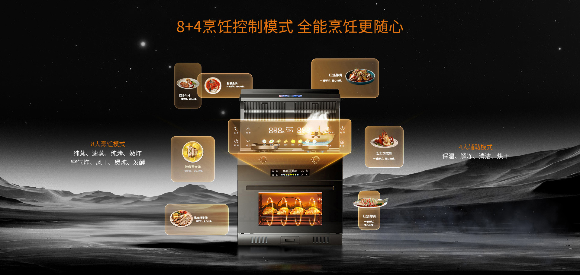 防爆免清洗集成灶標配8+4烹飪模式,可滿足純蒸、速蒸、純烤、嫩炸、空氣炸、風(fēng)干、煲燉、發(fā)酵等8大烹飪模式,滿足日常烹飪需求,同時配置4大輔助模式,可實現(xiàn)保溫、解凍、清潔、烘干。