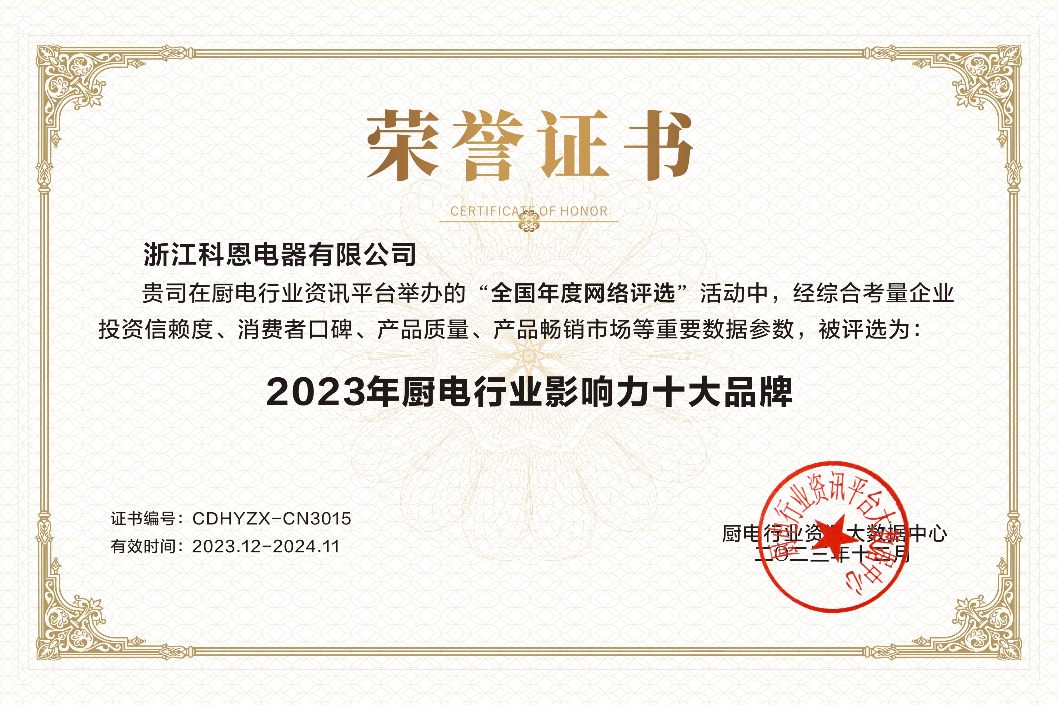 匠心“灶”就精品,品質見證實力!2023年,浙江科恩電器有限公司再次憑借實力連獲3獎!