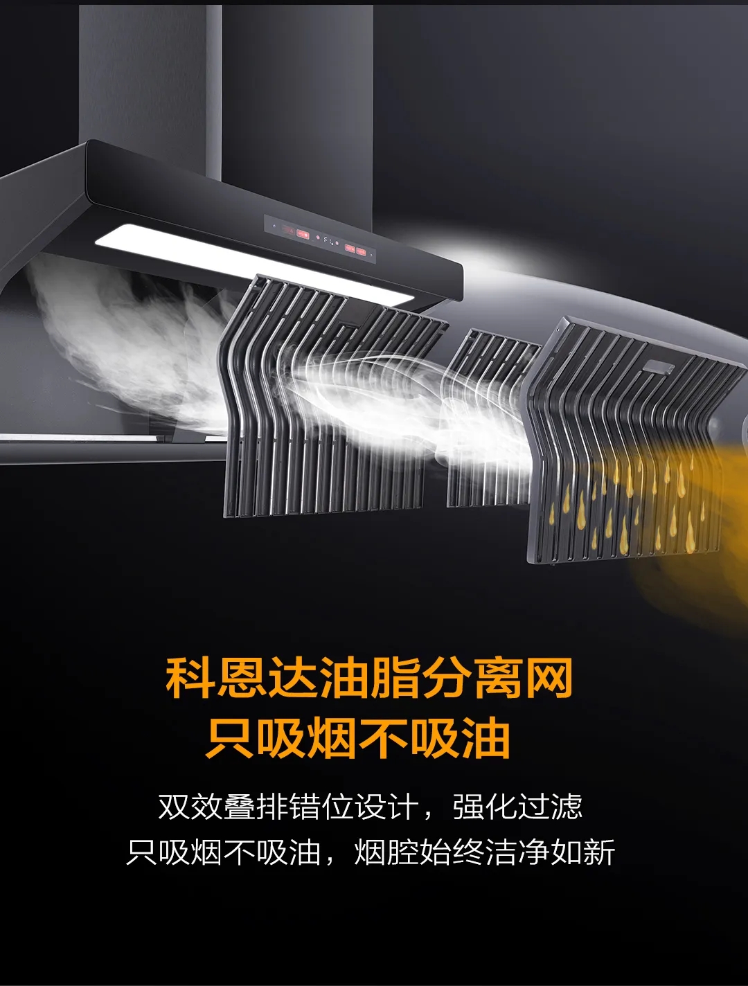 6530免清洗煙機(jī)可做到只吸煙不吸油。科恩達(dá)油脂分離網(wǎng)采用加厚太空壓鑄鋁,工藝嚴(yán)控,通過酸洗-噴砂-特氟龍噴涂-高溫?zé)Y(jié)而成,真正易潔、易拆、耐腐、不粘油、好打理且防火阻燃,可分離96%的油脂,讓煙腔內(nèi)部始終保持潔凈,很好的解決了煙機(jī)清洗難題。而整機(jī)特氟龍材質(zhì)真正做到了輕打理,只需輕輕一抹,油污去無蹤。