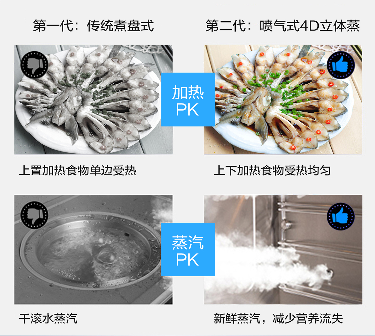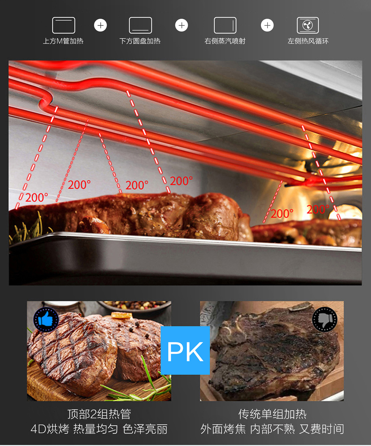 62L大容量食品級304不銹鋼內膽,上下4層設計,9種蒸烤模式。