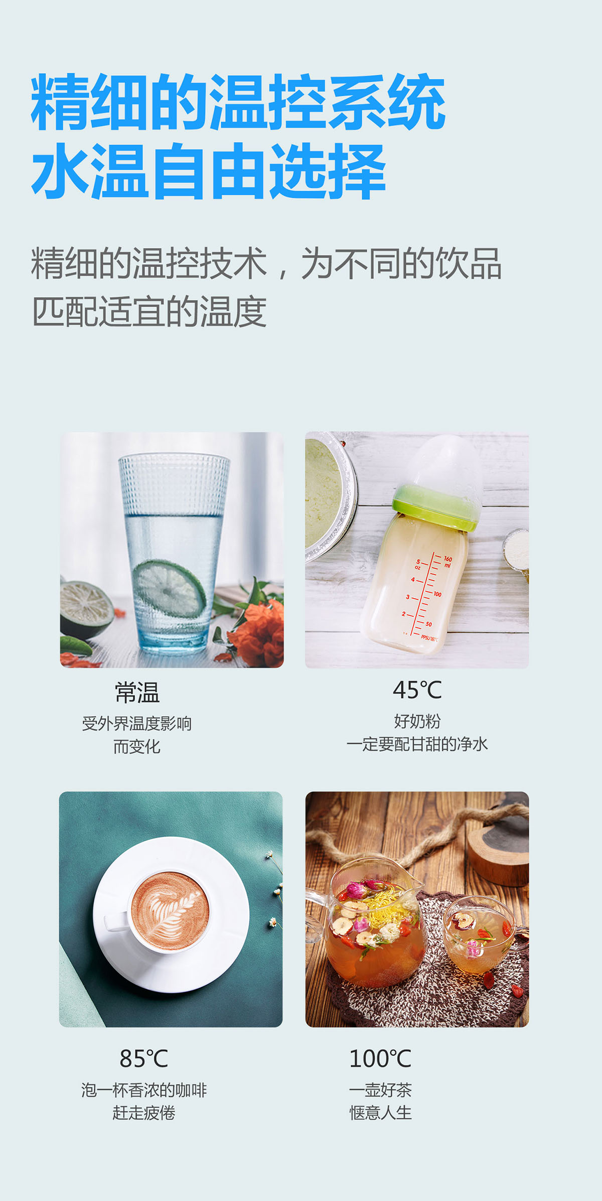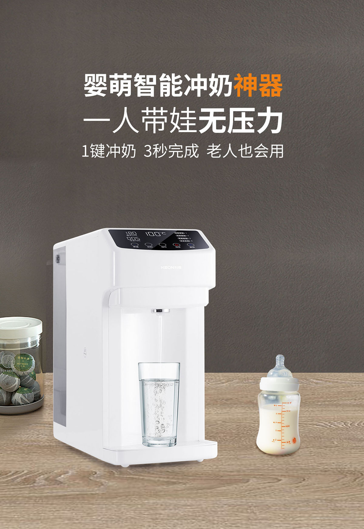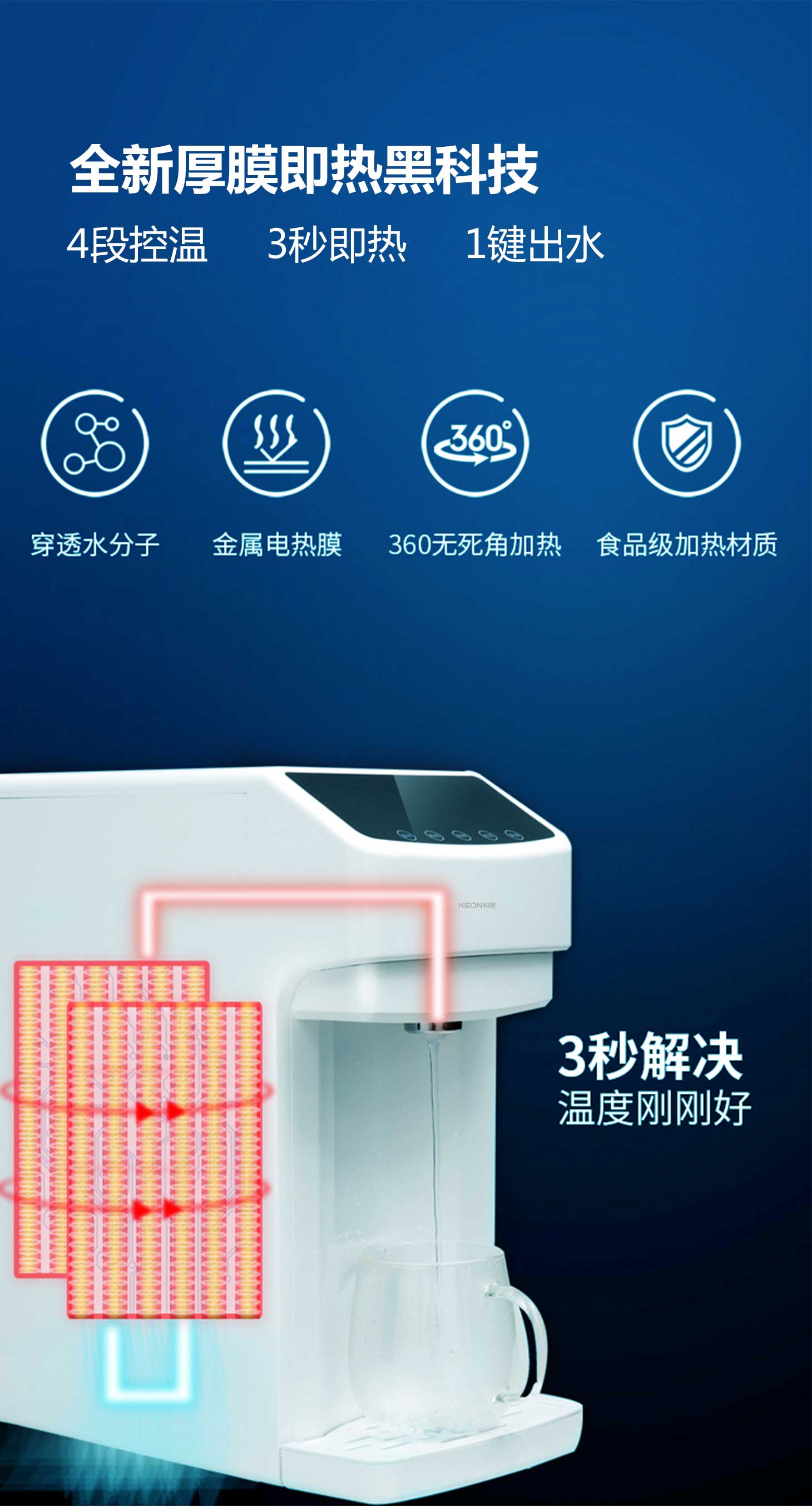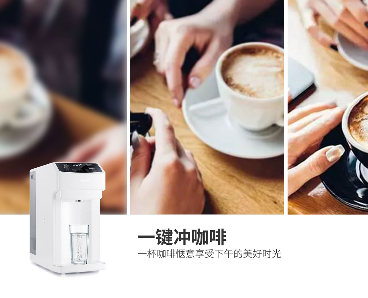 3秒速熱,4檔溫控(常溫、泡奶、沖咖啡、泡茶),一鍵操作,方便快捷