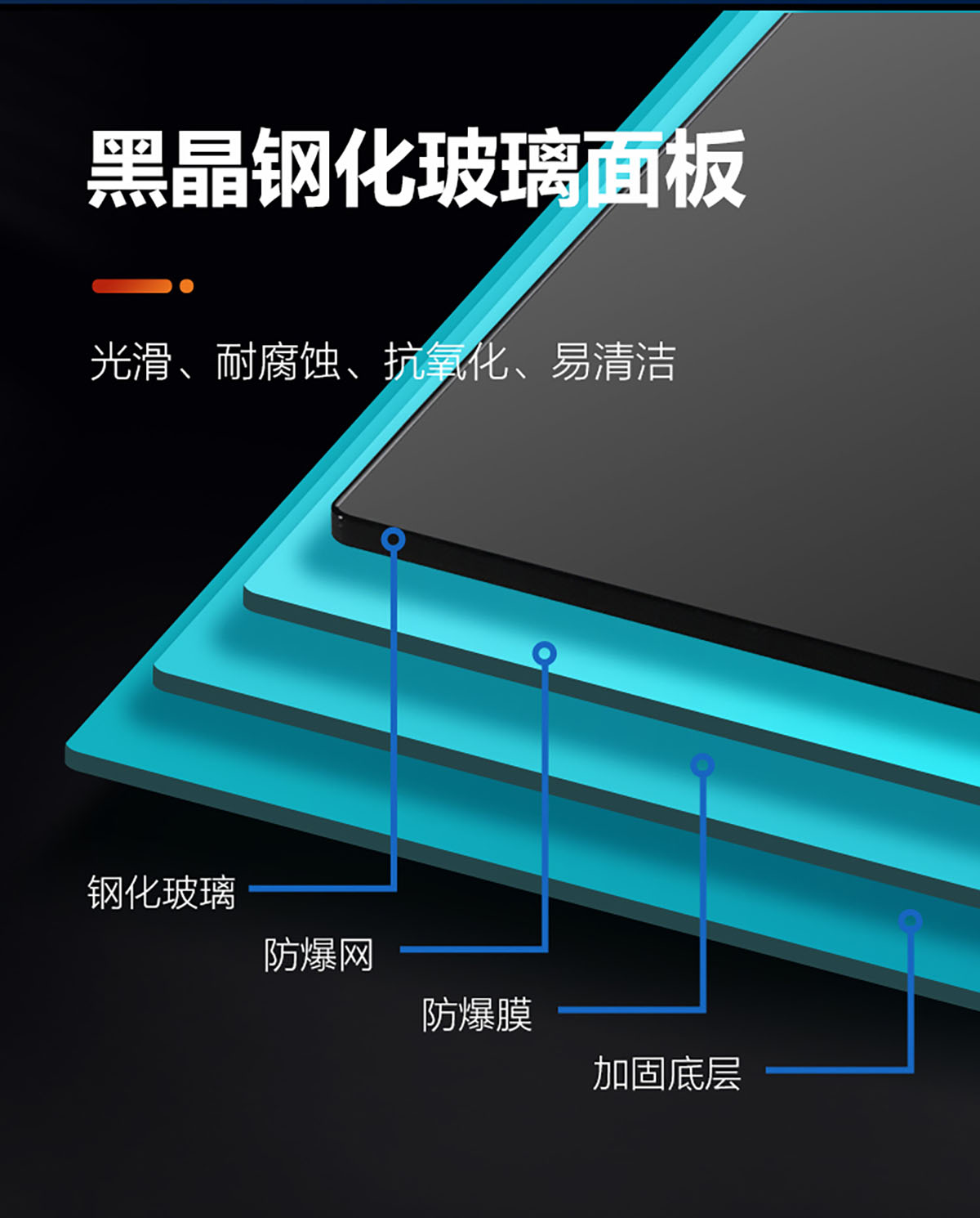 - 光滑、耐腐蝕、抗氧化、易清潔鋼化玻璃面板