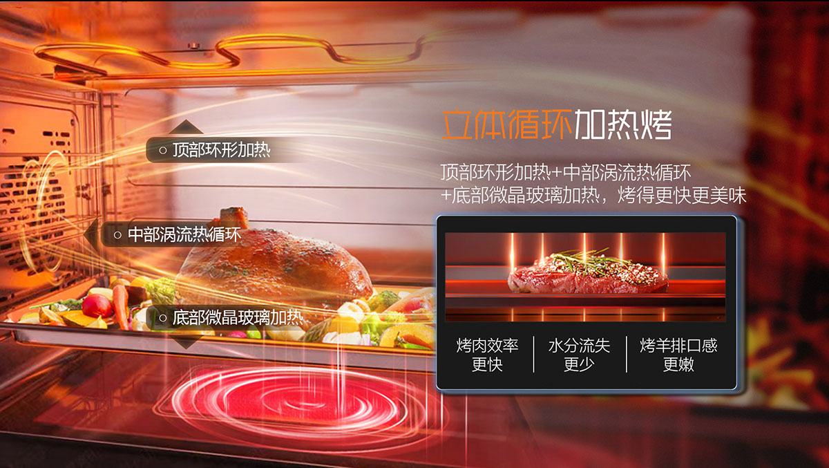 - 頂部環形加熱+中部渦流熱循環+底部微晶玻璃加熱,烤得更快更美味