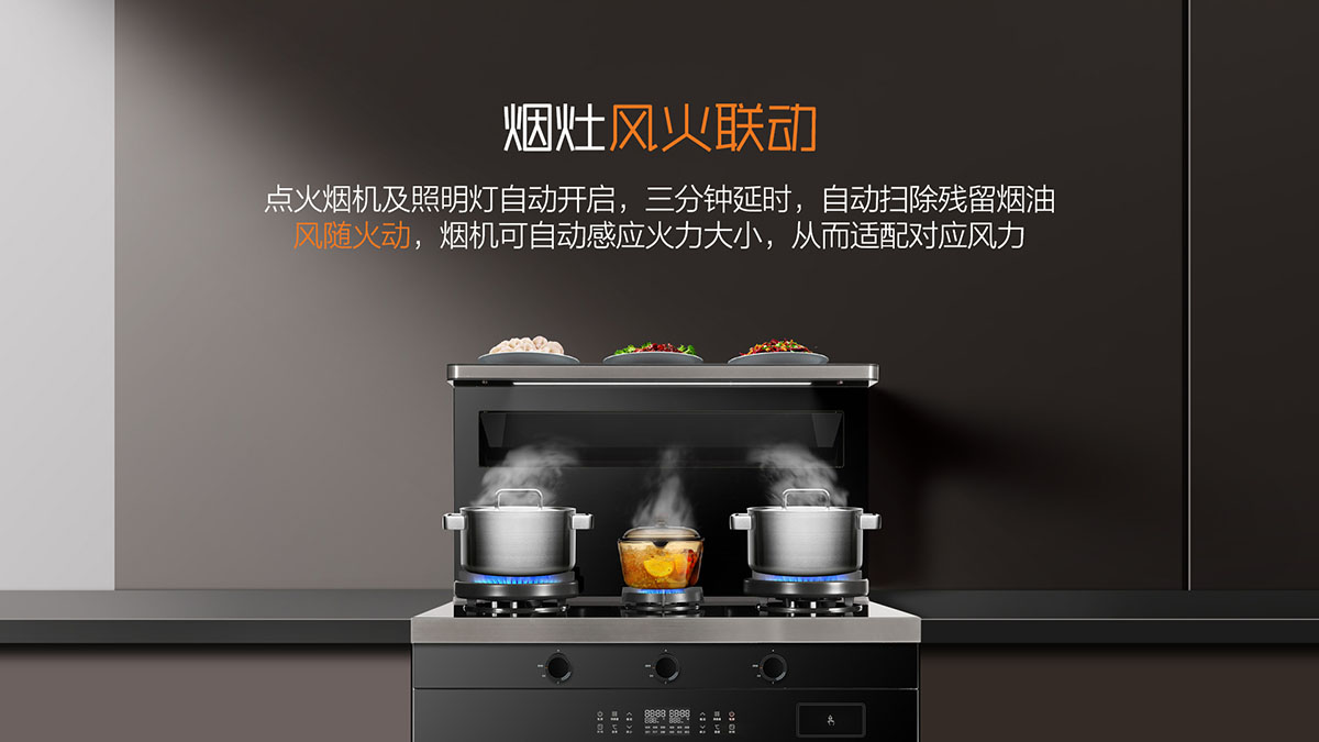 - 煙灶風火聯動,點火煙機及照明燈自動開啟,風量隨火力大小自動調節