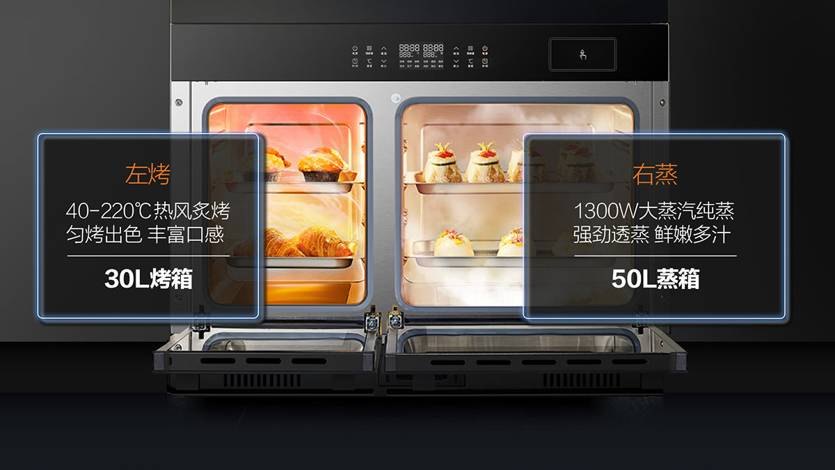 - 蒸烤獨立,高效多元,集成烹飪,樂享智慧廚房