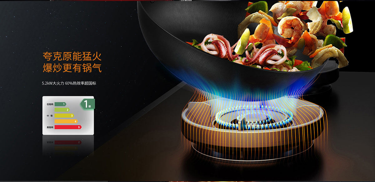 一級能效,5.2kW 大火力,全進風設計,燃燒充分,爆炒給力