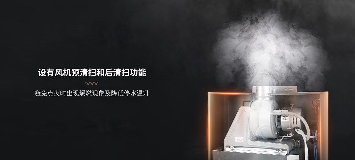 設有⻛機預清掃和后清掃功能,避免點⽕時出現爆燃現象及降低停⽔溫升
