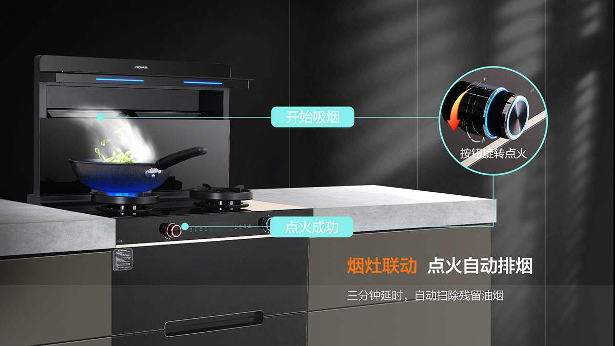煙灶聯(lián)動(dòng),點(diǎn)火自動(dòng)排煙,三分鐘延時(shí),自動(dòng)掃除殘留油煙