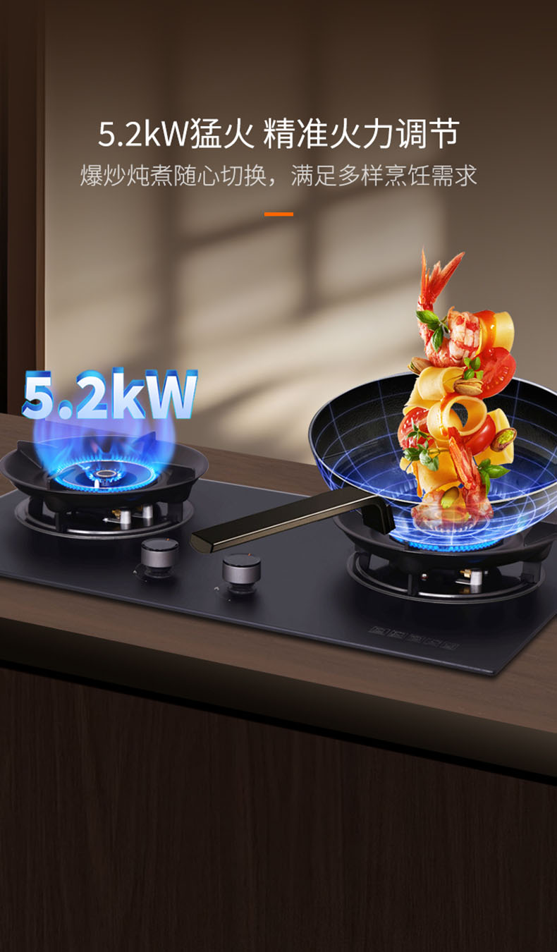 - 5.2KW猛火,精準(zhǔn)火力調(diào)節(jié),爆炒燉煮隨心切換