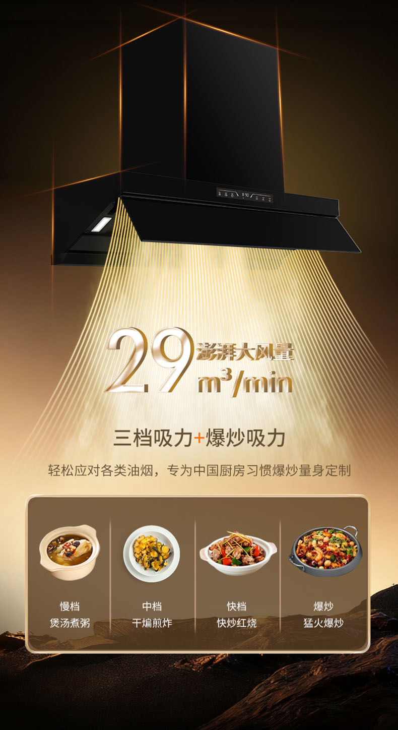 29m³/min澎湃大吸力,烹飪?nèi)虖N房空氣清爽