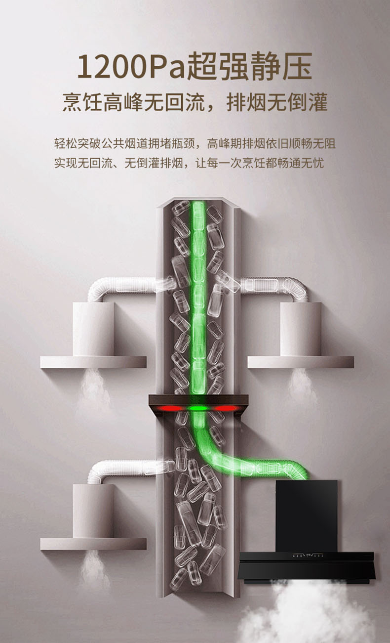 1200Pa超強(qiáng)靜壓,烹飪高峰無回流,排煙無倒灌