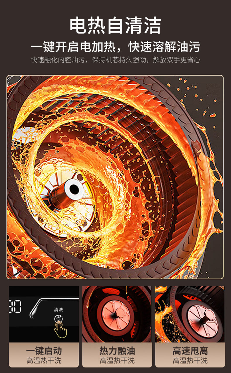 電熱自清潔,一鍵開啟電加熱,快速溶解油污